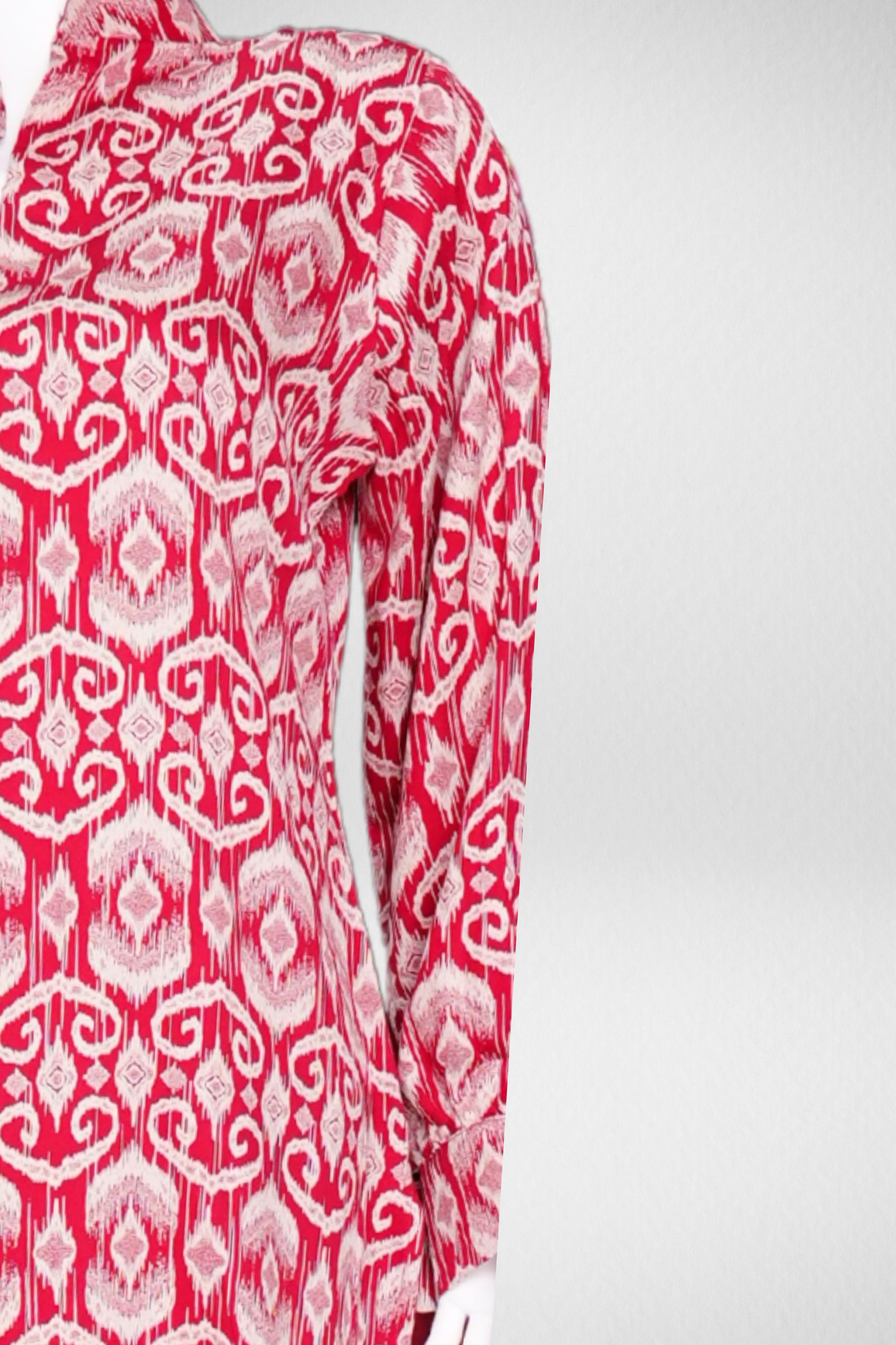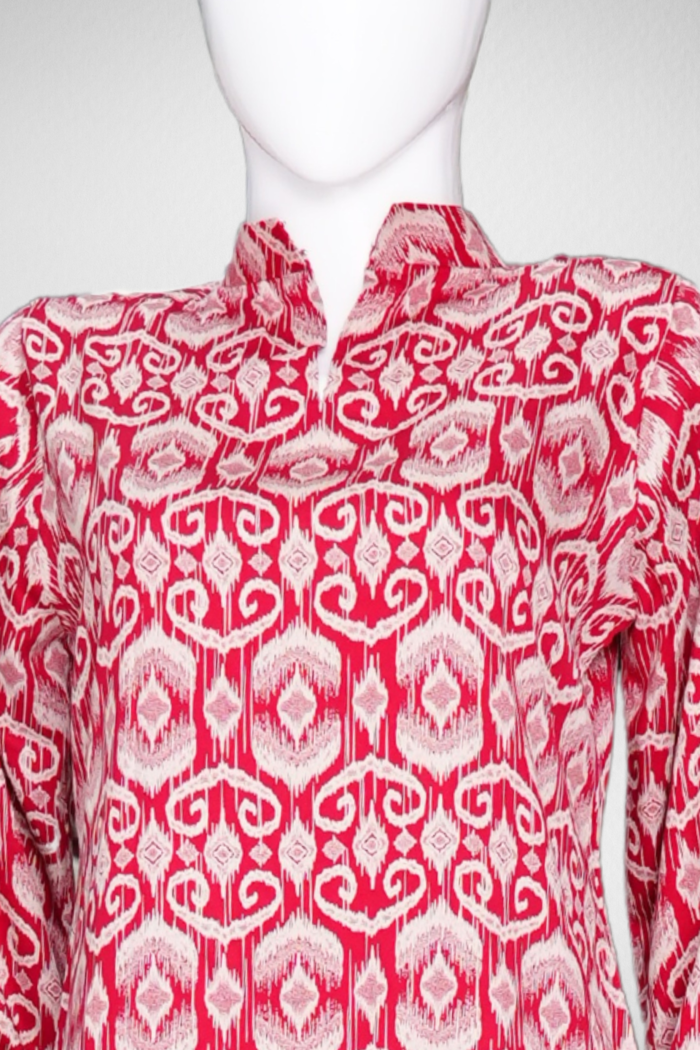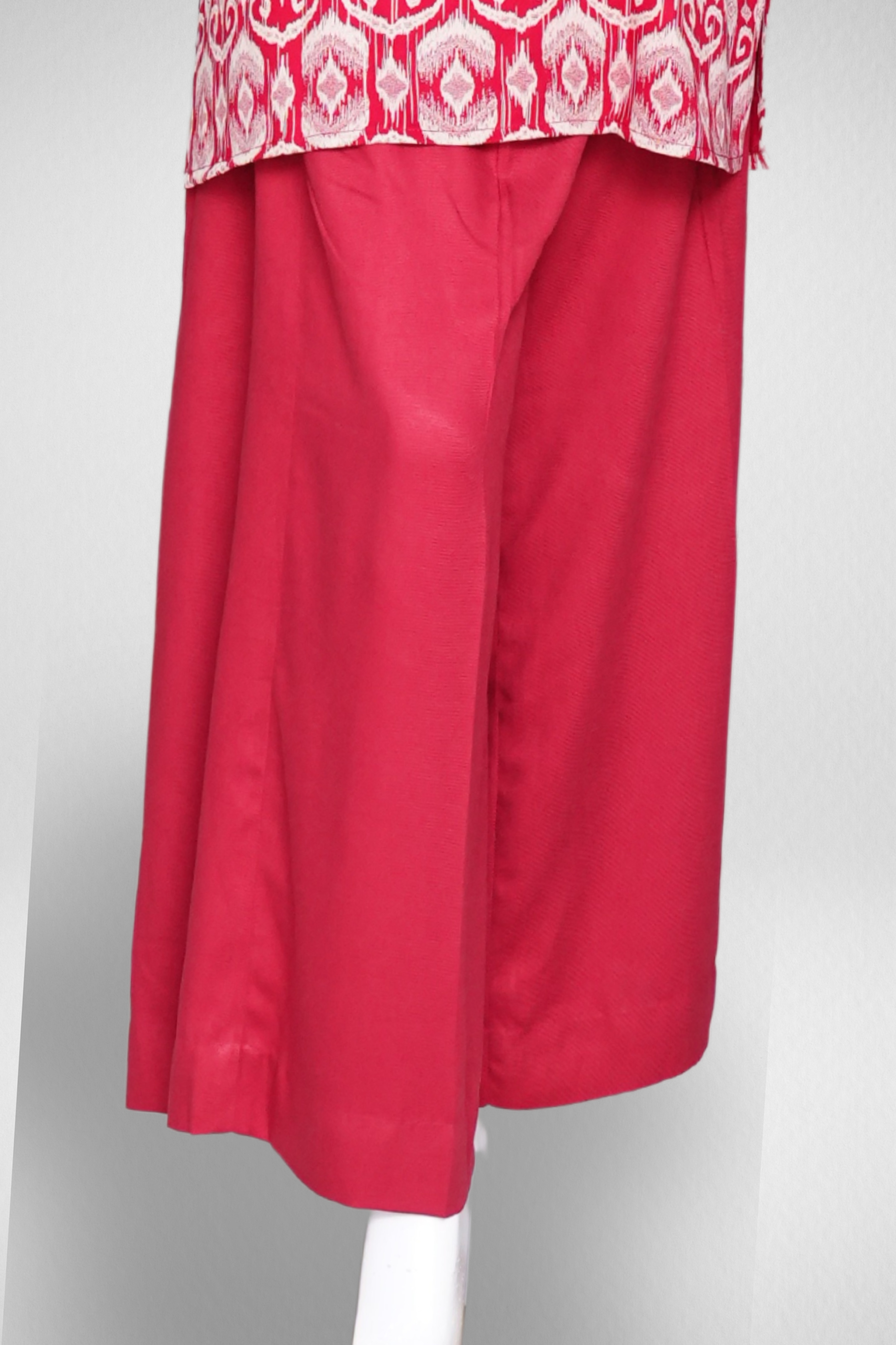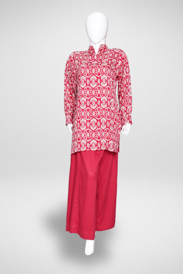 Desigen: The shirt features a ben neck and full sleeves, adorned with embroidery. The straight pants match the shirt in color and material. Without further information, specifics like brand, exact materials, and embellishment details are difficult to determine.