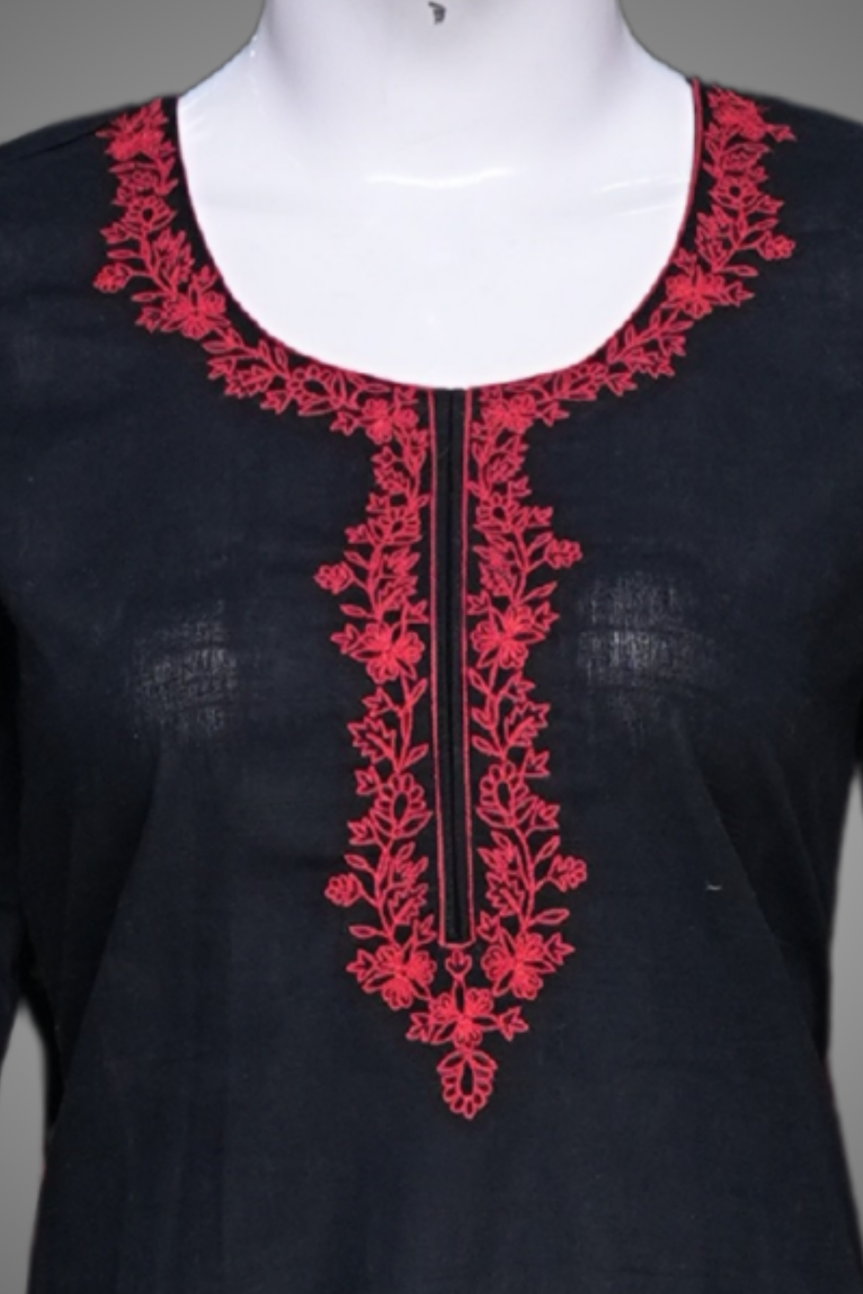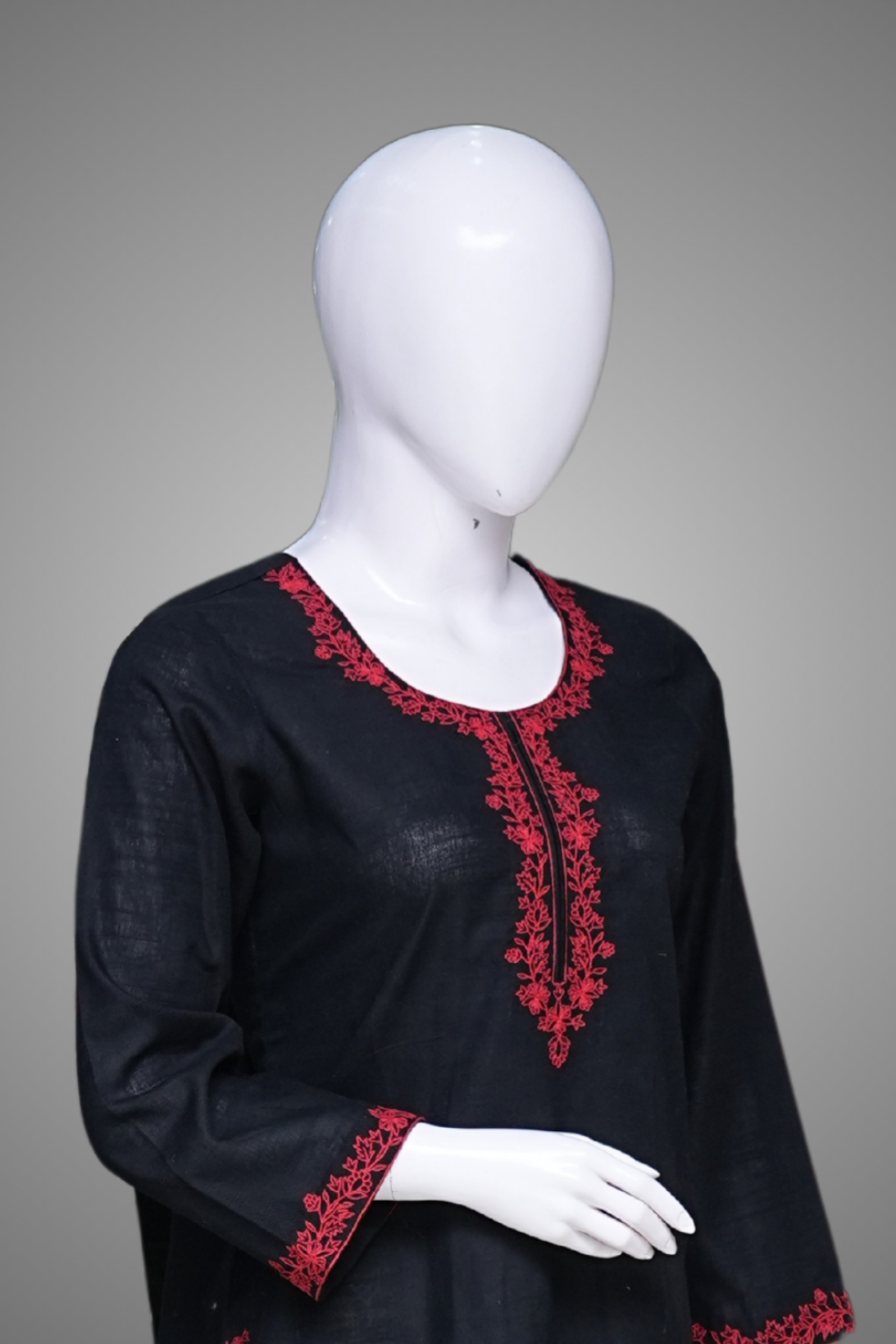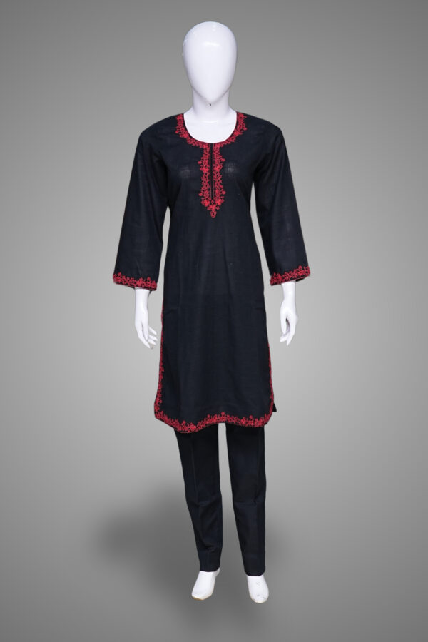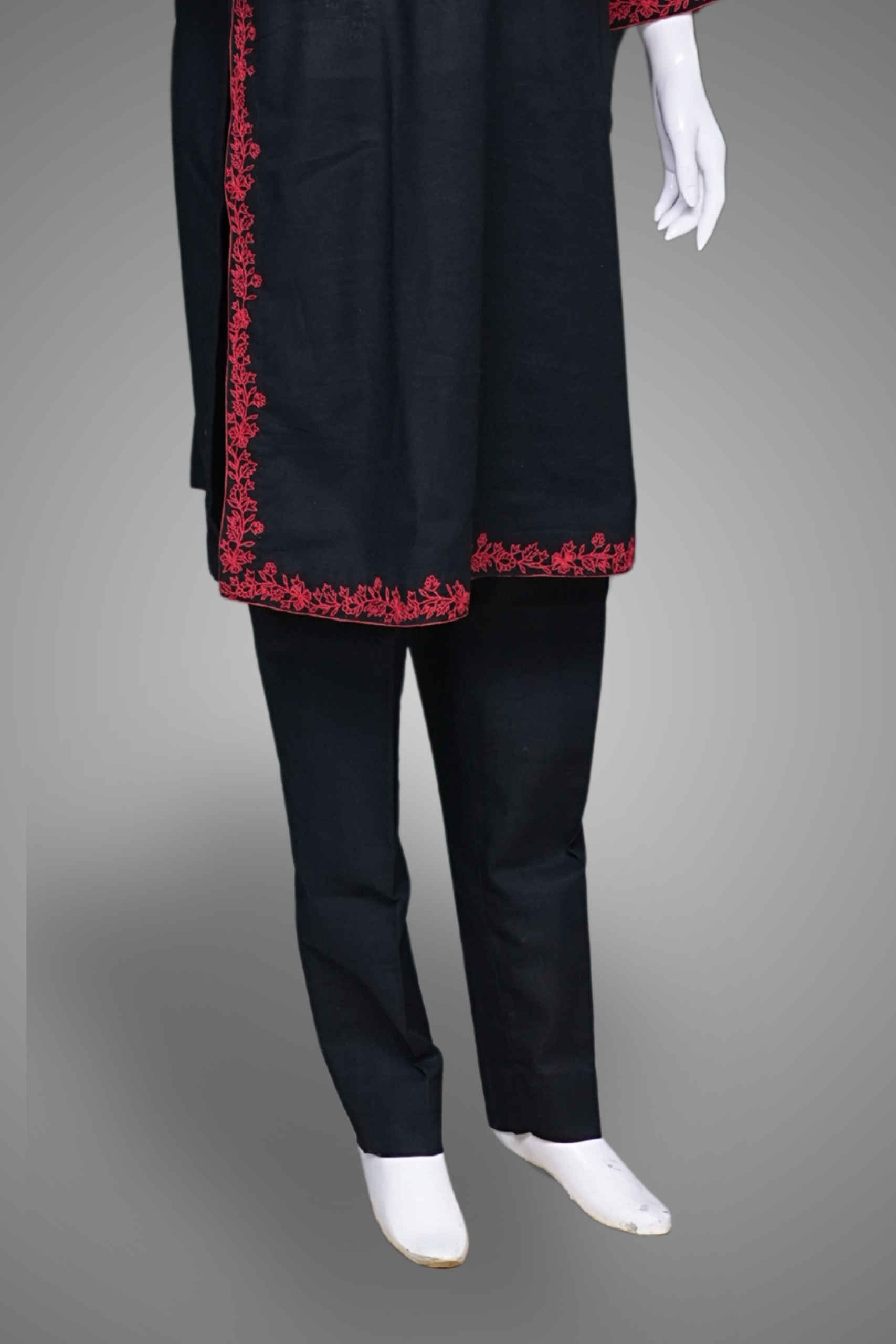 Desigen: The shirt features a round neck and full sleeves, the fabric is khaddar, thread hand embroidery on neck, sleeves and bottom. The trouser is plain khaddar fabric. Black color 2 piece suit and red thread hand embroidery