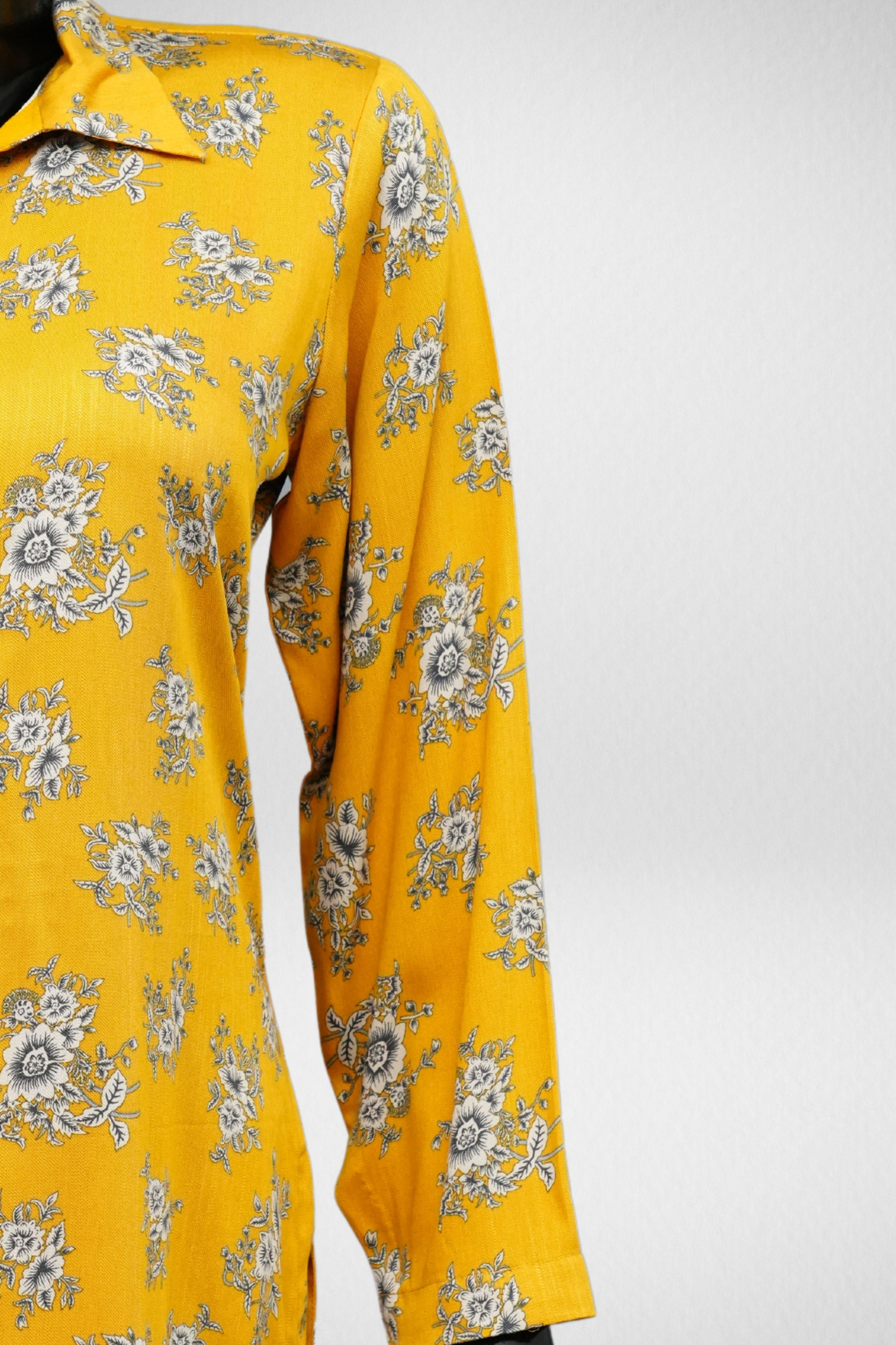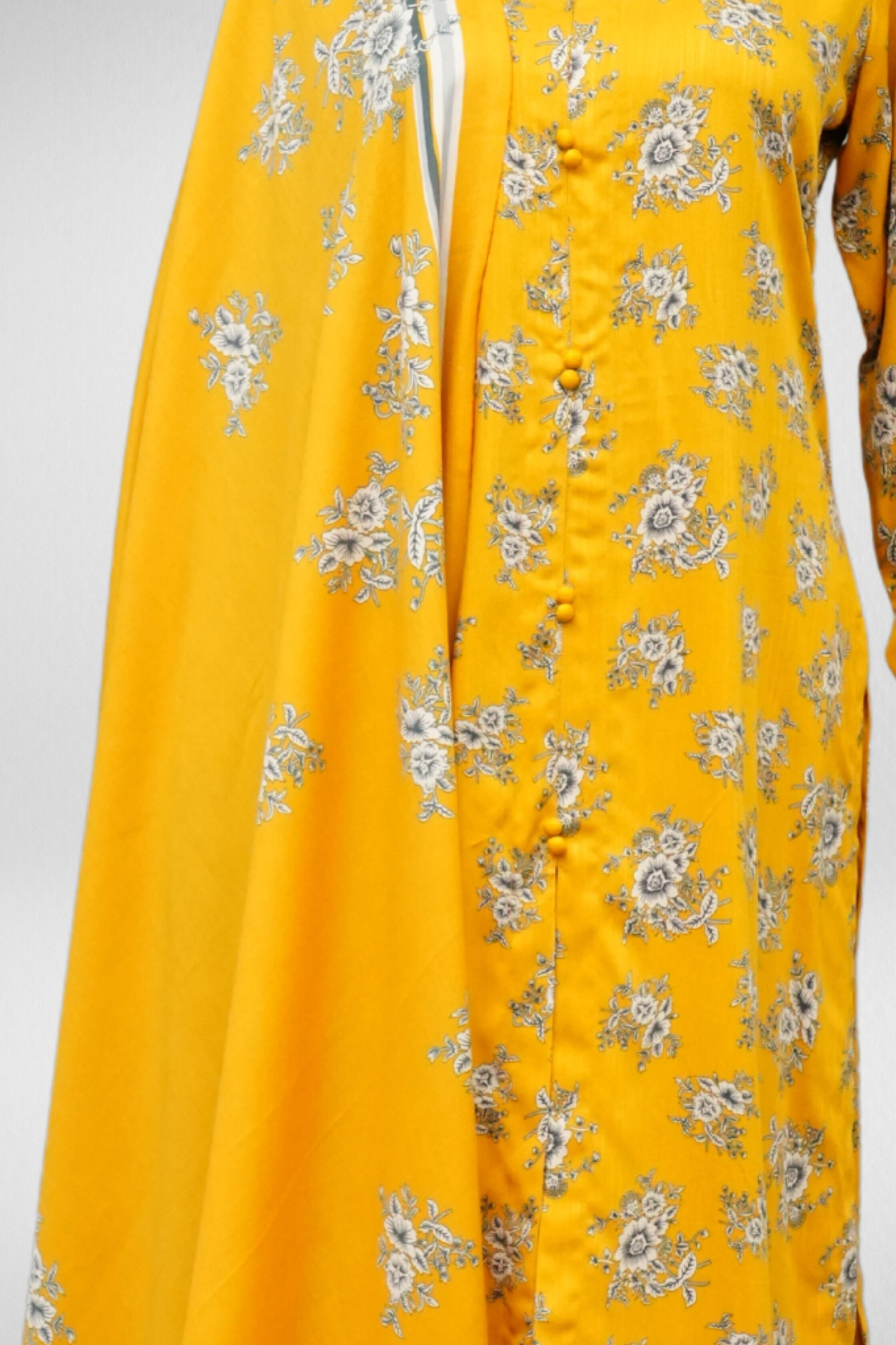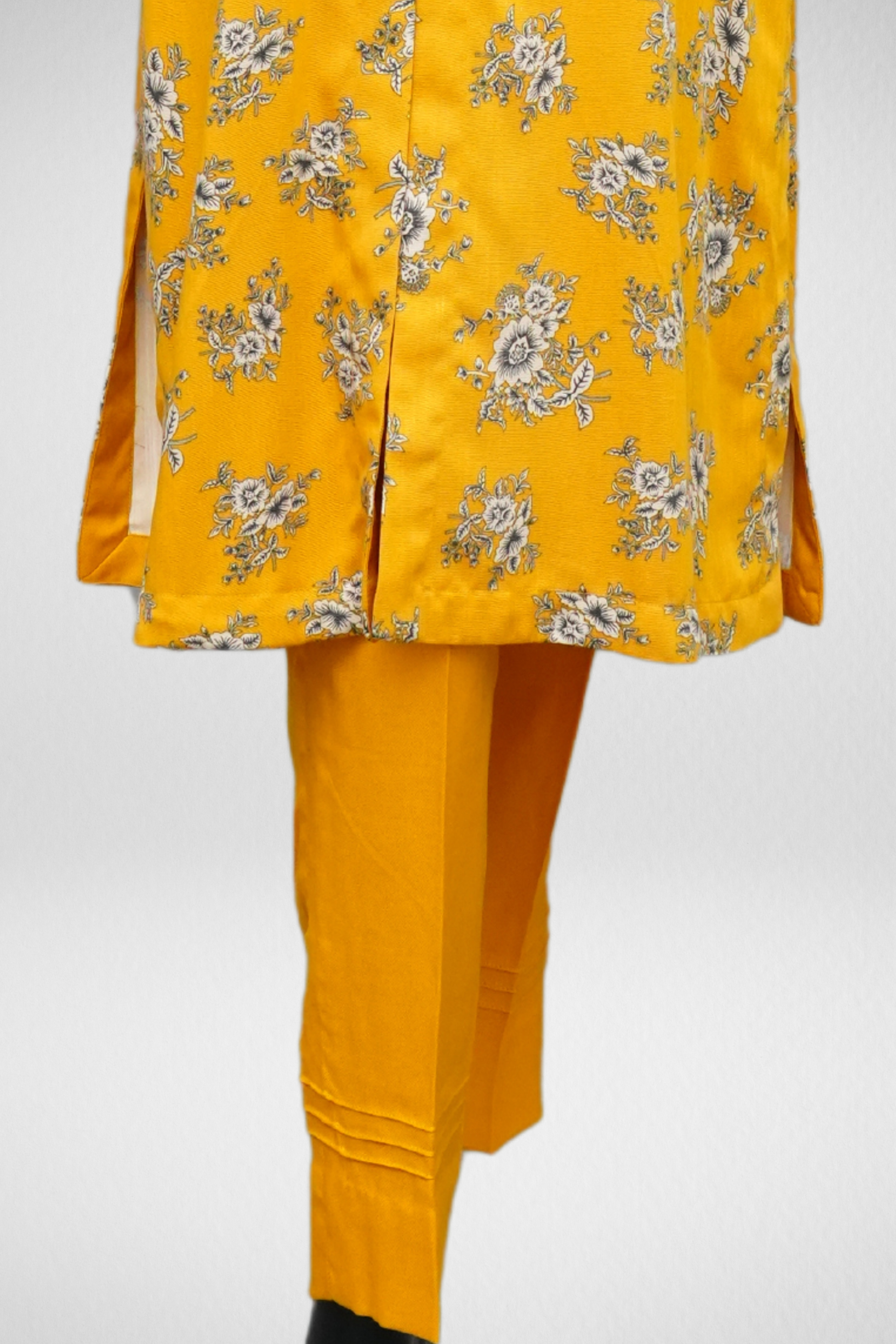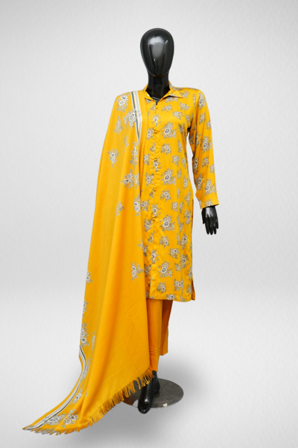 Design Description: The shirt features a collar neck and full sleeves hand sleeves design, the fabric is marina, collar neck marina printed shirt with printed dupatta. The trouser is plan marina fabric. Mustard color 2 piece suit.