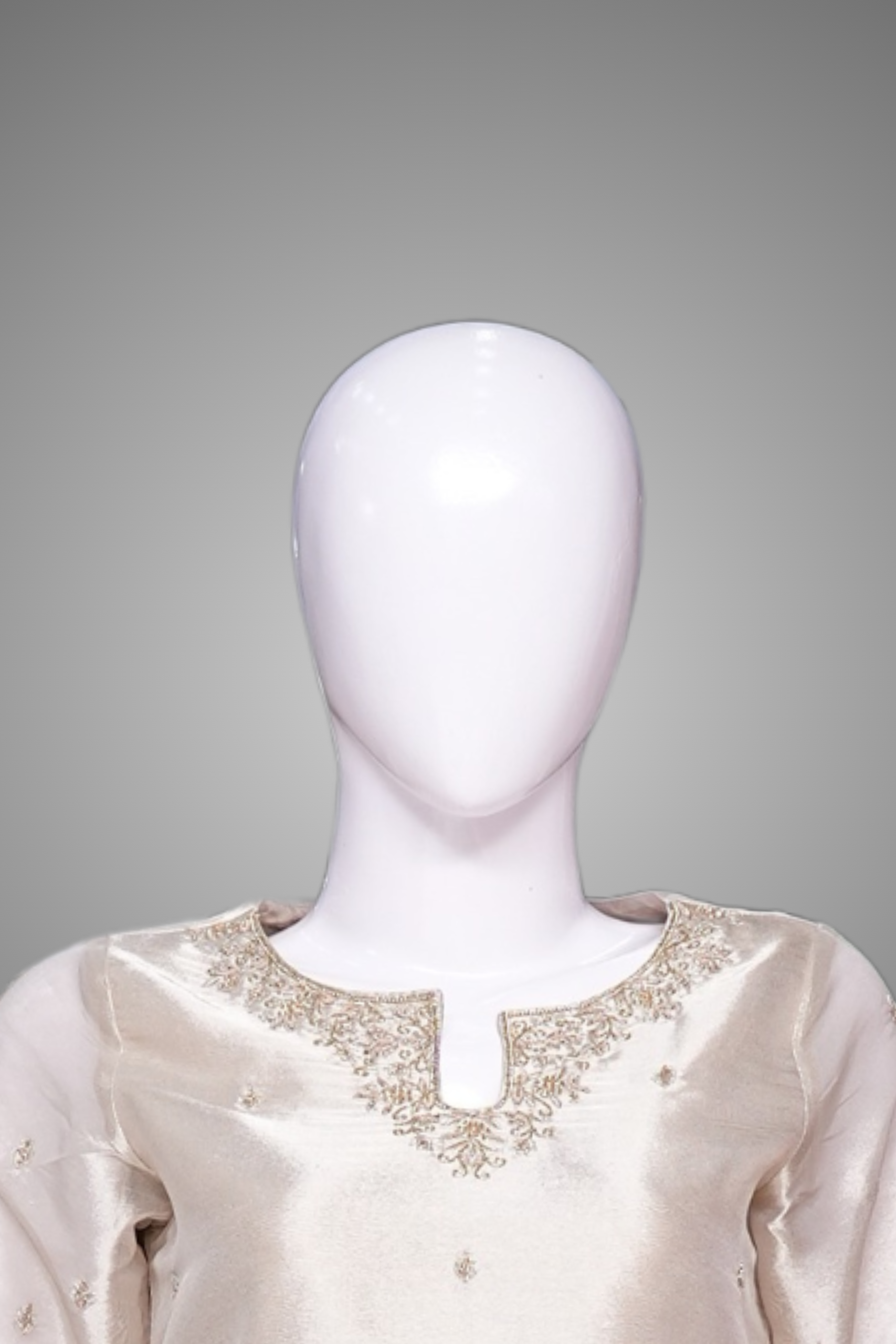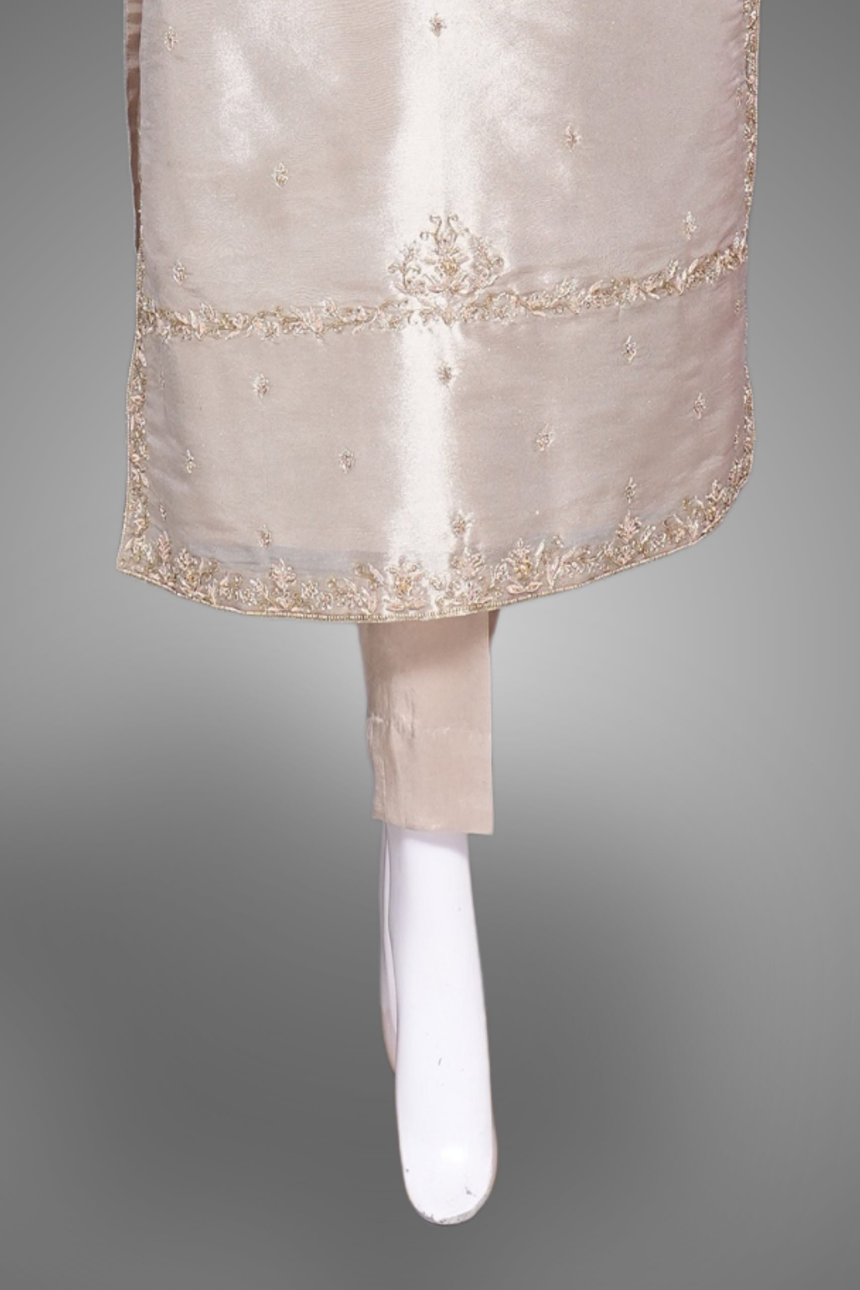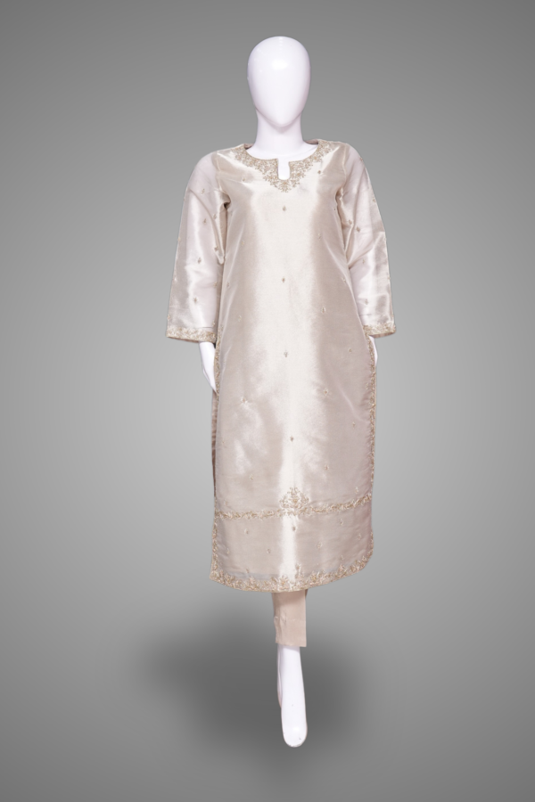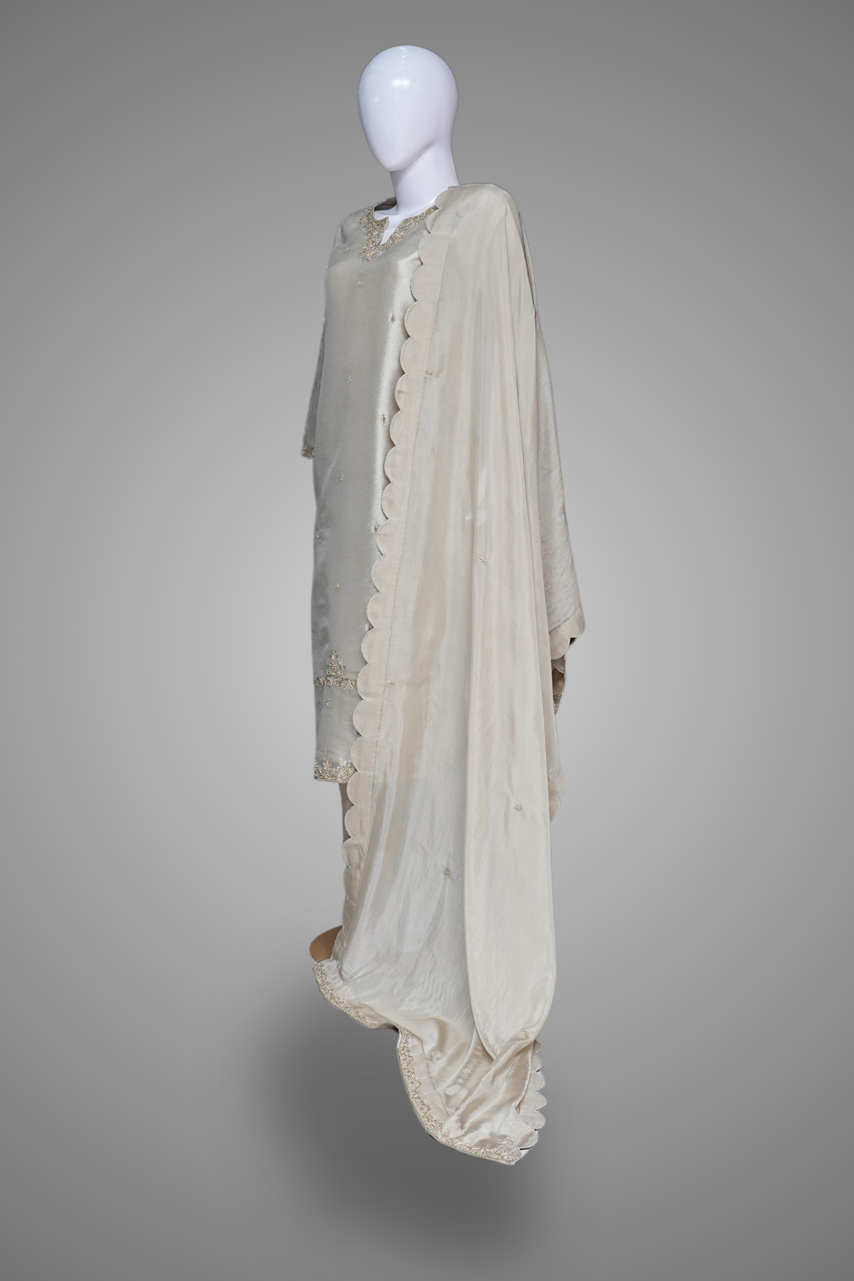 Desigen: The shirt features a round neck and full sleeves, the fabric is raw silk, Hand Embroidery on shirt, sleeves, bottom and dubatta. The trouser is plain with silk fabric. Gray color 3 piece suit