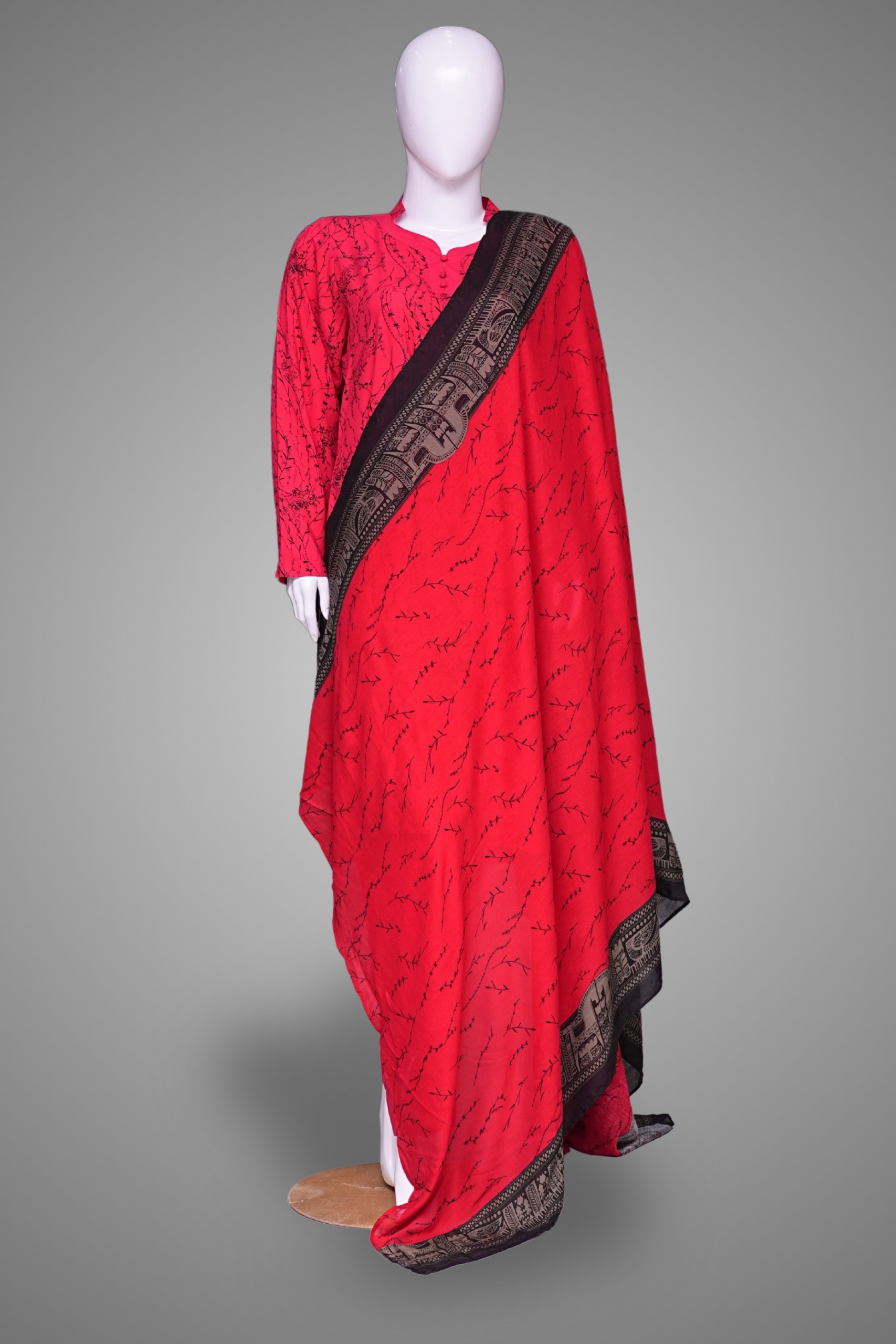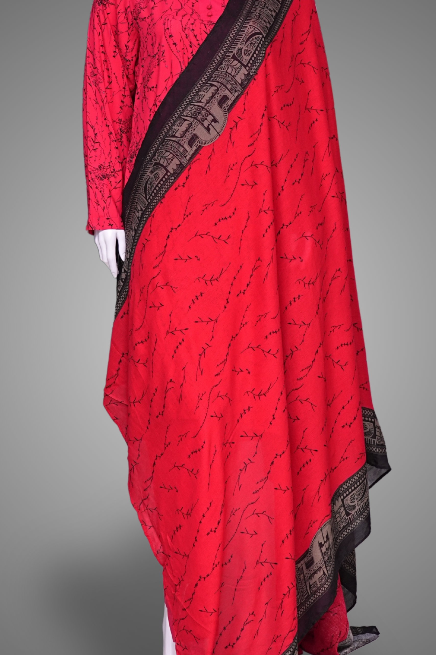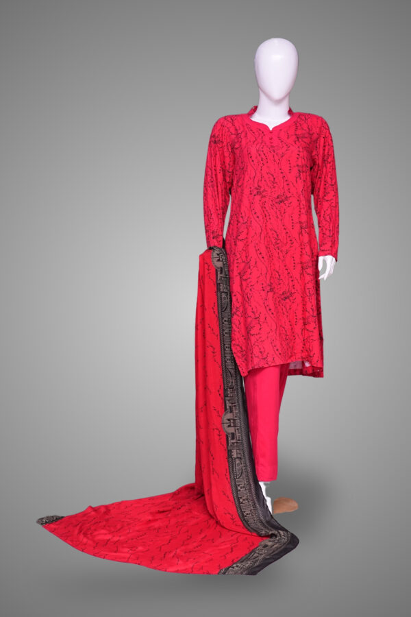 Desigen: The shirt features a half ban collar neck and full sleeves, the fabric is linen, Linen half ban collar with printed shirt and dupatta. The trouser is plain linen fabric. Red color 3 piece suit.