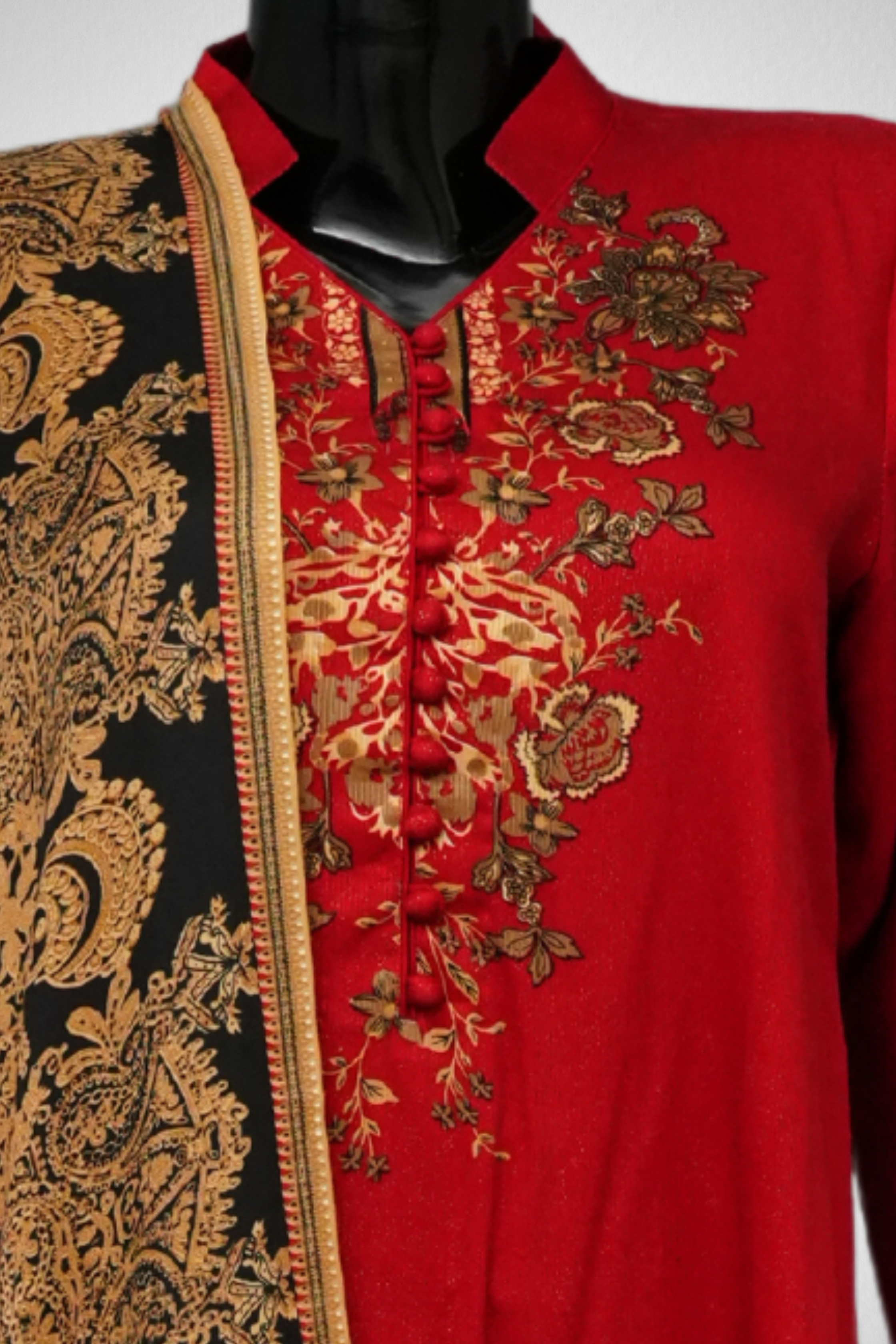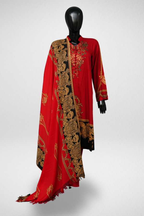 Design Description: The shirt features a ban collar neck and full sleeve, the fabric is Khaddar, ban collar Khaddar printed short shirt with printed dupatta. The trouser is plan Khaddar fabric. red color 3 piece suit.