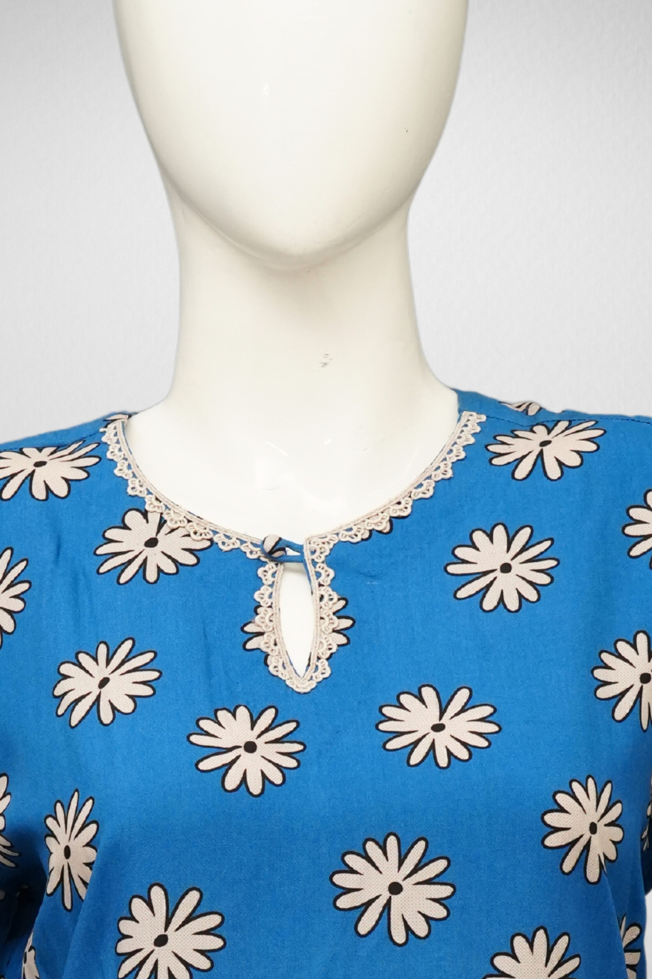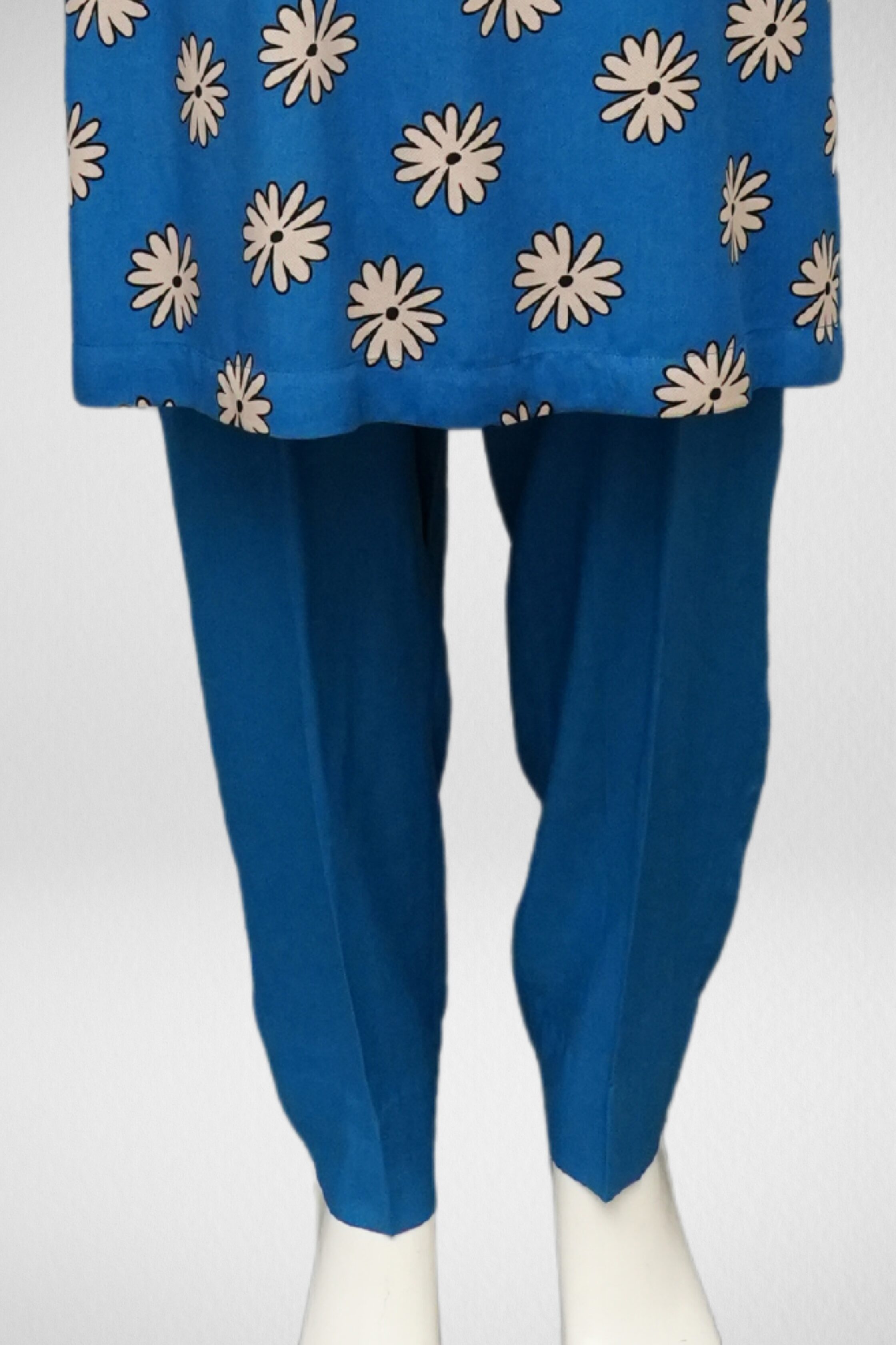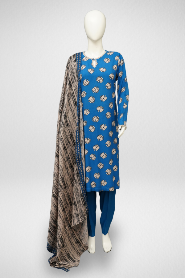 Design Description: The shirt features a ban collar neck and full sleeve, the fabric is Khaddar, ban collar Khaddar printed short shirt with printed dupatta. The trouser is plan Khaddar fabric. Blue color 3 piece suit.