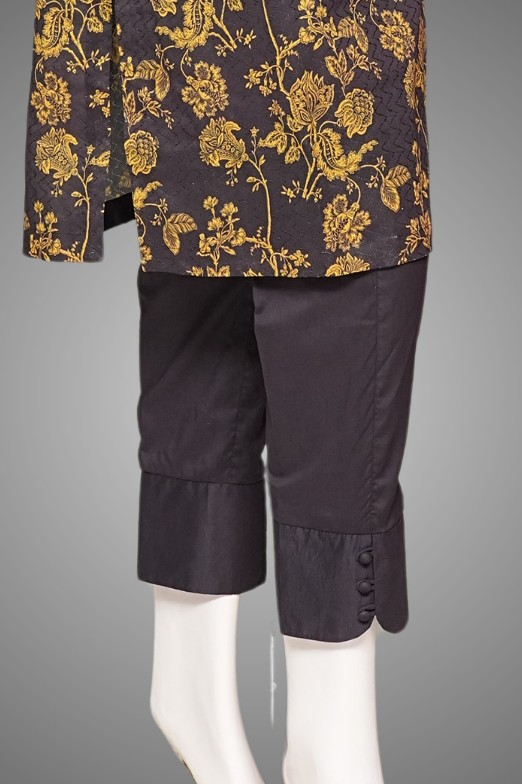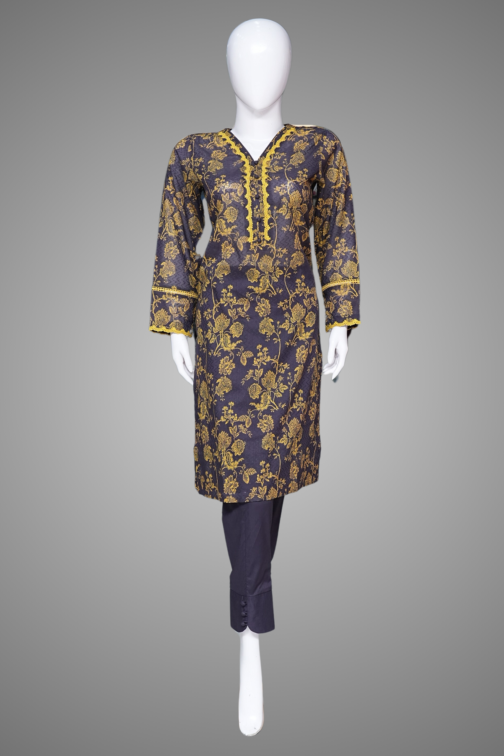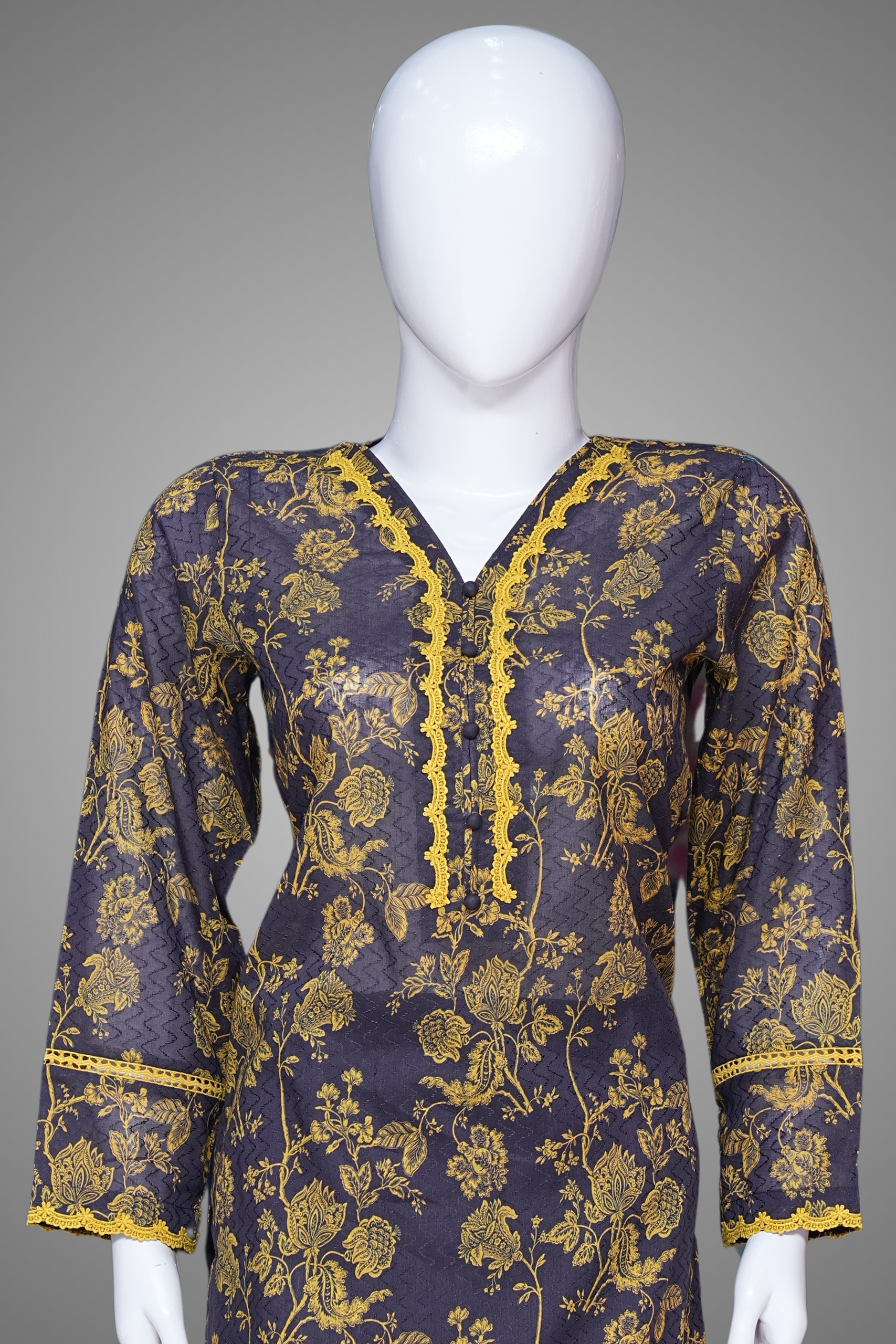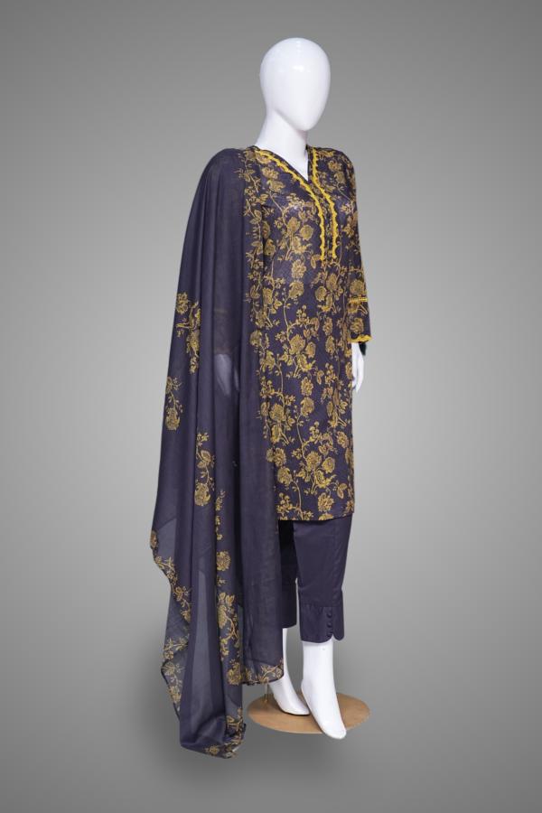 Design Description: The shirt features V gala and full sleeve, the fabric is Lawn, Butten style, Lawn printed shirt with printed dupatta. The trouser is plan Lawn fabric black color 3 piece suit.