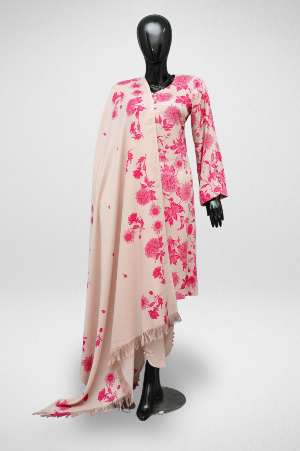 Design Description: The shirt features a round neck and full sleeve, the fabric is marina, round marina printed shirt with printed dupatta. The trouser is plan marina fabric. Cream Tan color 2 piece suit.