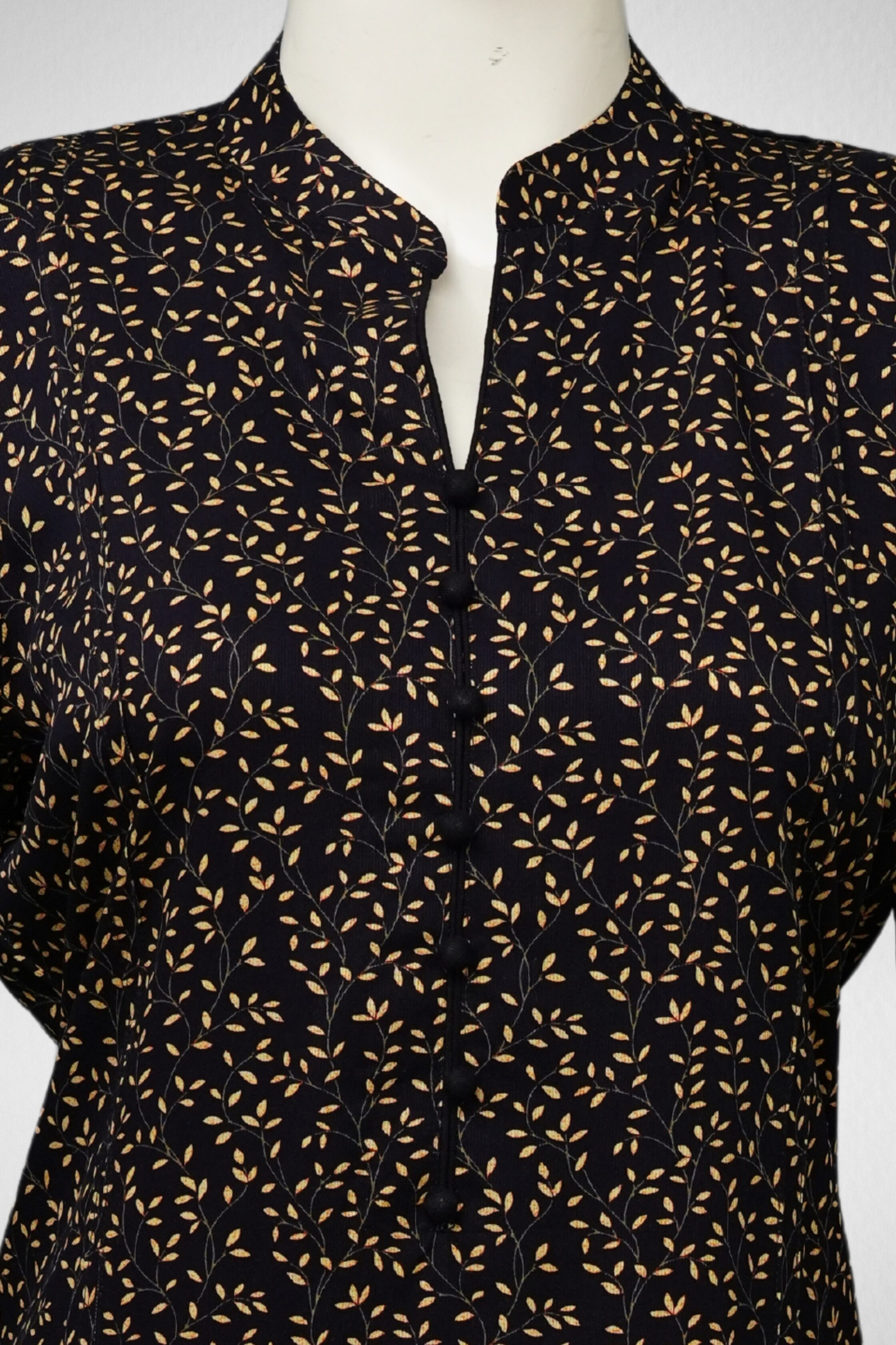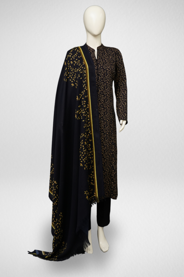 Design Description: The shirt features a round neck and full sleeve, the fabric is marina, Round marina printed shirt with printed dupatta. The trouser is plan marina fabric. Denim color 3 piece suit.